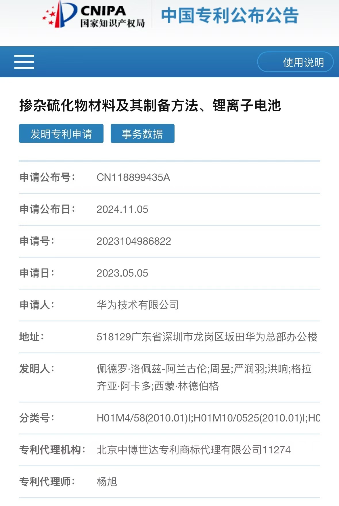 11月5日,华为公布了一项硫化物固态电解质新发明,名为《掺杂硫化物材料及其制备方法、锂离子电池》。