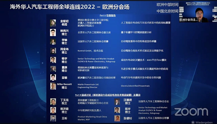 2022年11月5日北京时间20:00,作为本次全球连线第二天活动的欧洲分会场在线上顺利召开。欧洲专场的主题为汽车技术电动化及智能化,专场活动分为两个部分,主题演讲部分和圆桌部分,分别由奥中科技交流协会副会长陶剑波博士和全英华人汽车工程师协会副主席唐华寅博士主持。专场很荣幸地邀请到了多位行业资深专家与知名学者,就汽车电动化,智能化的发展现状与展望进行了交流与讨论。