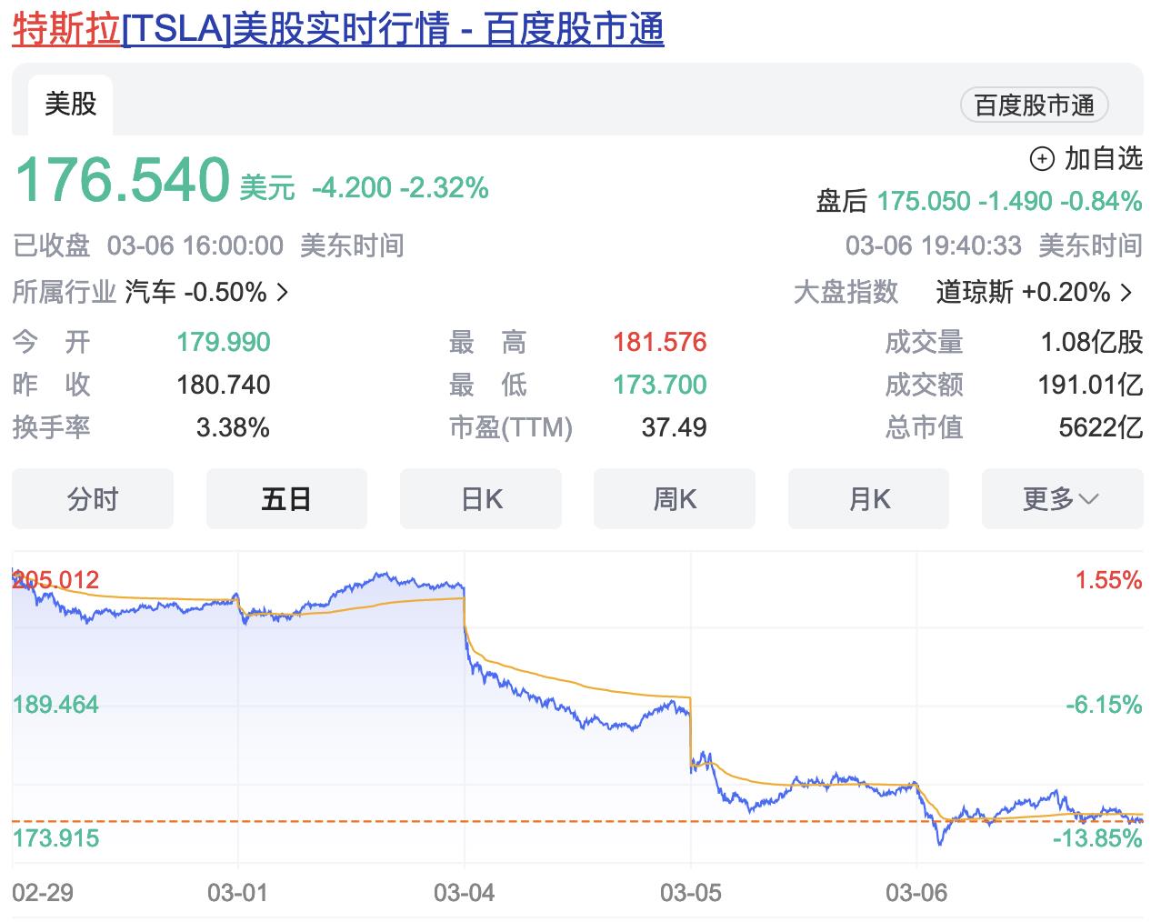 3月6日,特斯拉的收盘价为176.54美元,下跌2.32%,连续第三天下跌。此前摩根士丹利分析师下调了特斯拉的目标价,称尽管大幅降价,但包括中国在内的主要市场的电动汽车需求仍在继续疲软。