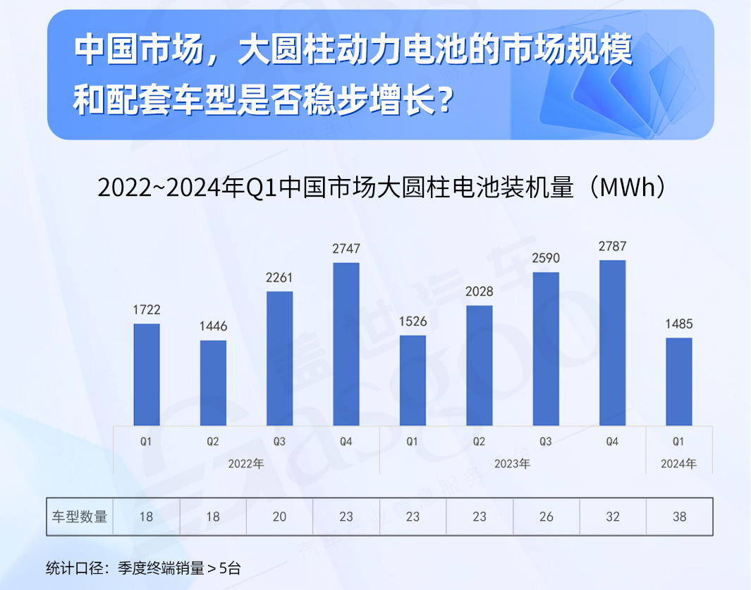 从市场规模和配套车型数量来看,中国大圆柱动力电池市场呈现出稳步增长的趋势。2023年总装机量达到8931MWh,同比提升9.2%。同时,配套车型数量也实现了翻倍增长,从2022年的18台增加至2024年第一季度的38台。这表明越来越多的车企开始选择大圆柱动力电池作为动力来源,以满足市场对高性能、长续航电动汽车的需求。